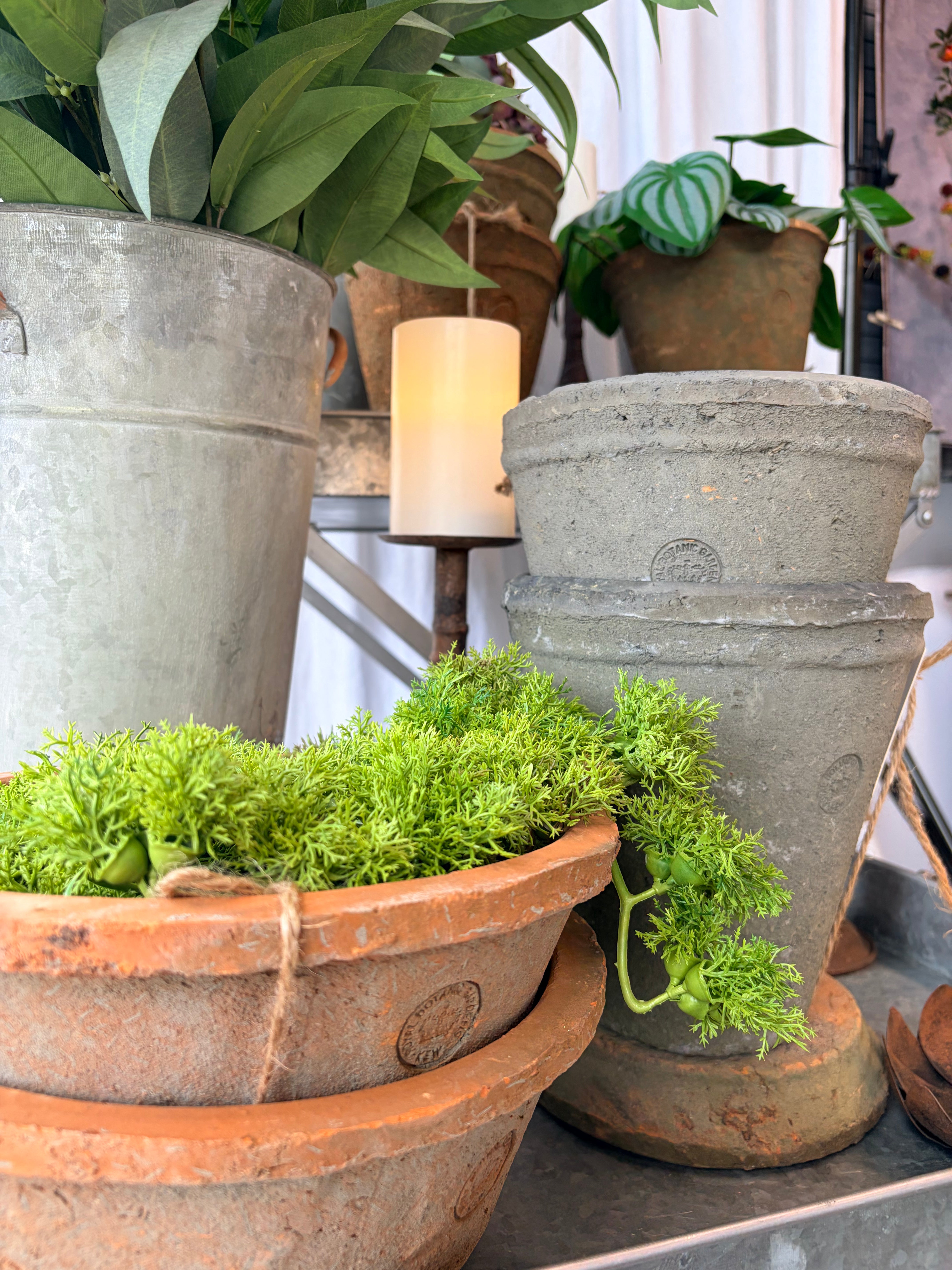 Merchandising Tip: Set the zinc tables with stacked buckets, lotus dishes and candle holders. Stack Long Toms and dish planters beside. "Build Your Courtyard Look - Perfect with Plants"