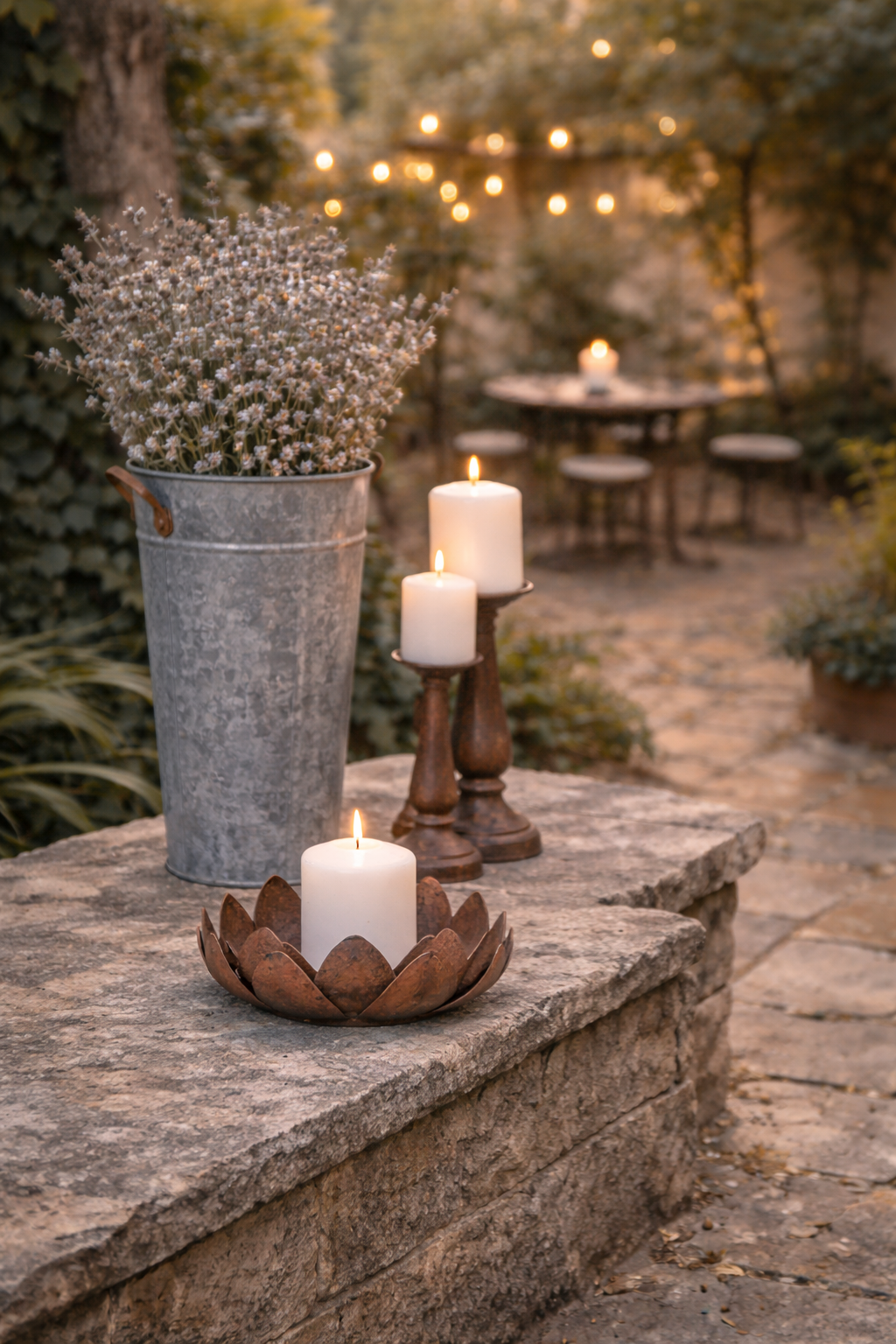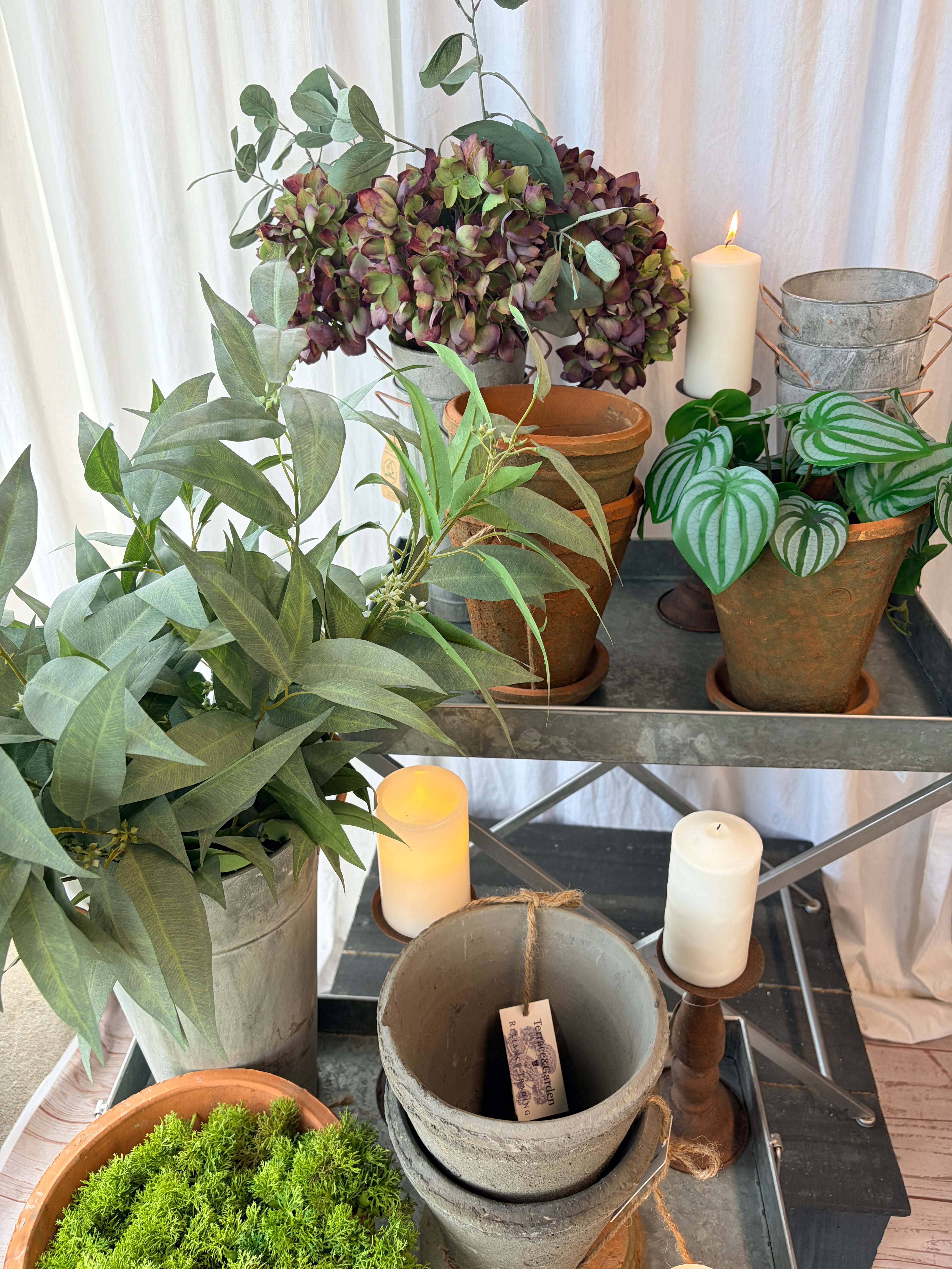 A ready-to-merchandise “Courtyard Entertaining” display: pots + glow pieces + nursery-native French florist buckets, anchored by a zinc folding table for an instant lifestyle vignette.