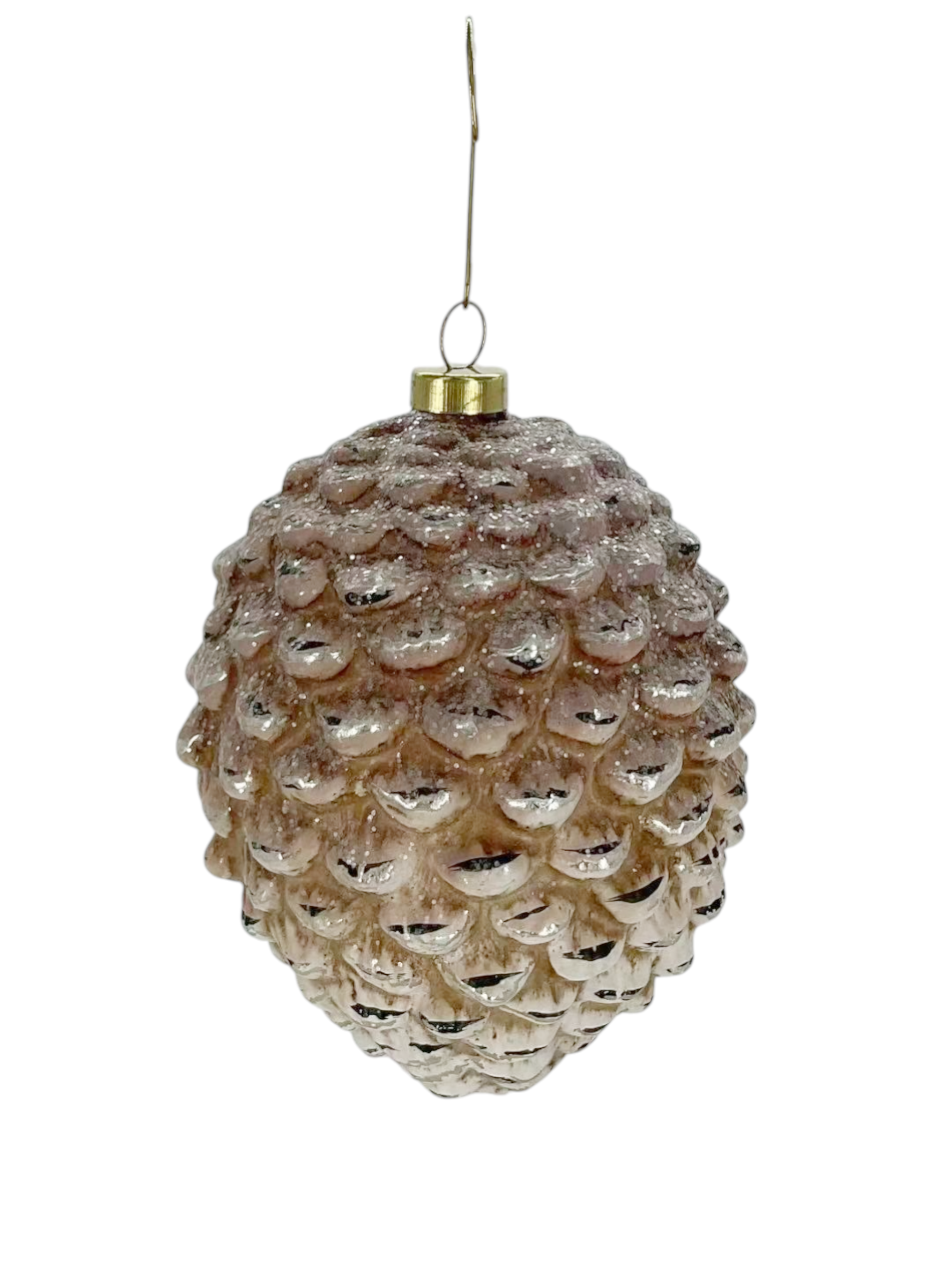 The tonal finish enhances the organic character of the pinecone while maintaining a polished glass surface that elevates it beyond rustic styling. Its proportion makes it ideal for weaving through foliage or anchoring botanical groupings, adding textural variation among smoother baubles and metallic accents.