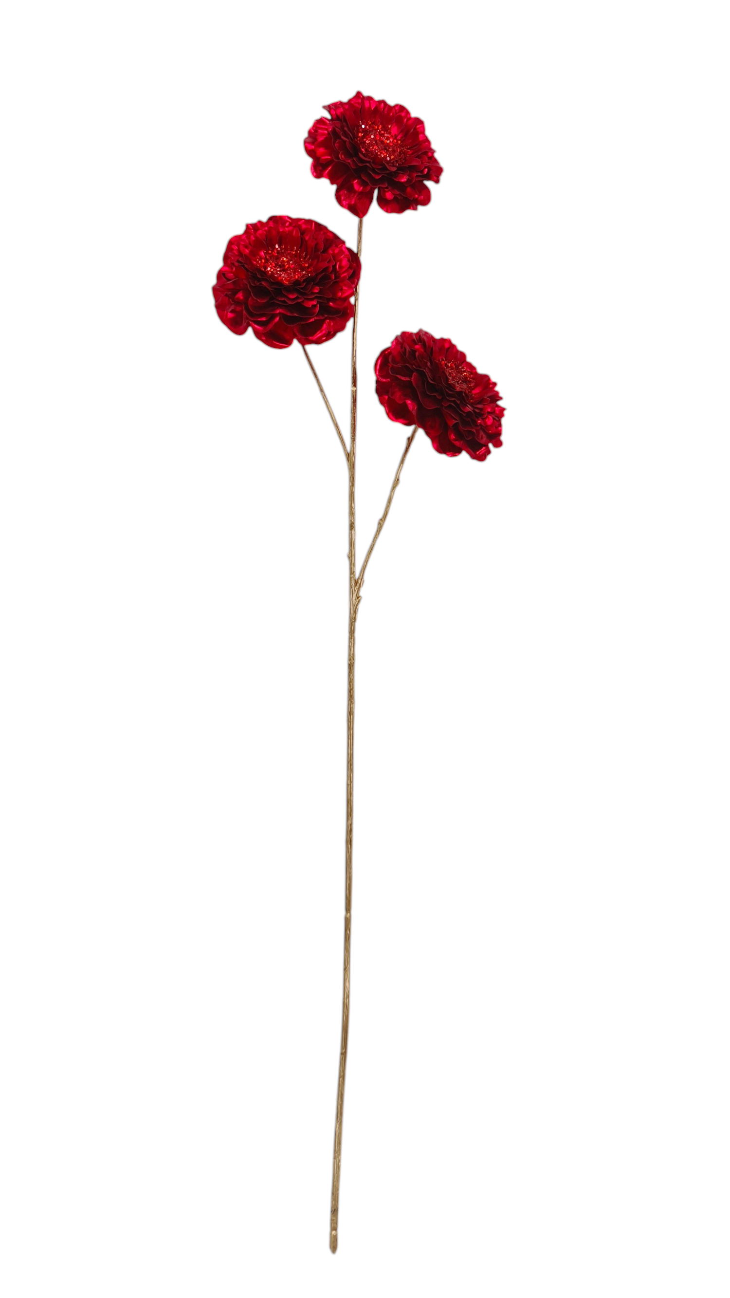 Featuring three sculpted zinnia blooms along a 72cm stem, this metallic floral spray delivers bold colour with refined structure. Each flower head is layered with dimensional petal detailing, finished in a rich red metallic tone that reflects light with controlled intensity.