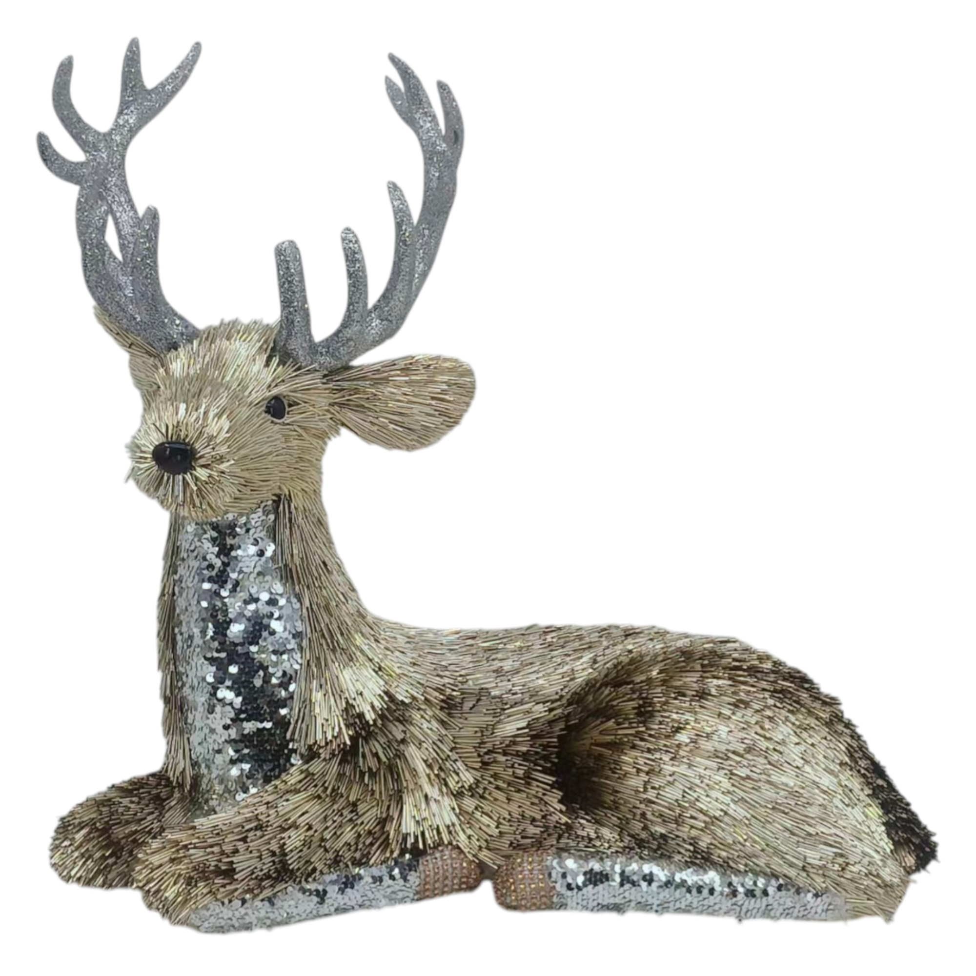 .Gracefully reclined at 63cm, this laying deer introduces sculptural elegance with a softly shimmering champagne tinsel finish. The fine metallic strands create a textured surface that catches ambient light from multiple angles, producing a luminous effect without harsh glare.