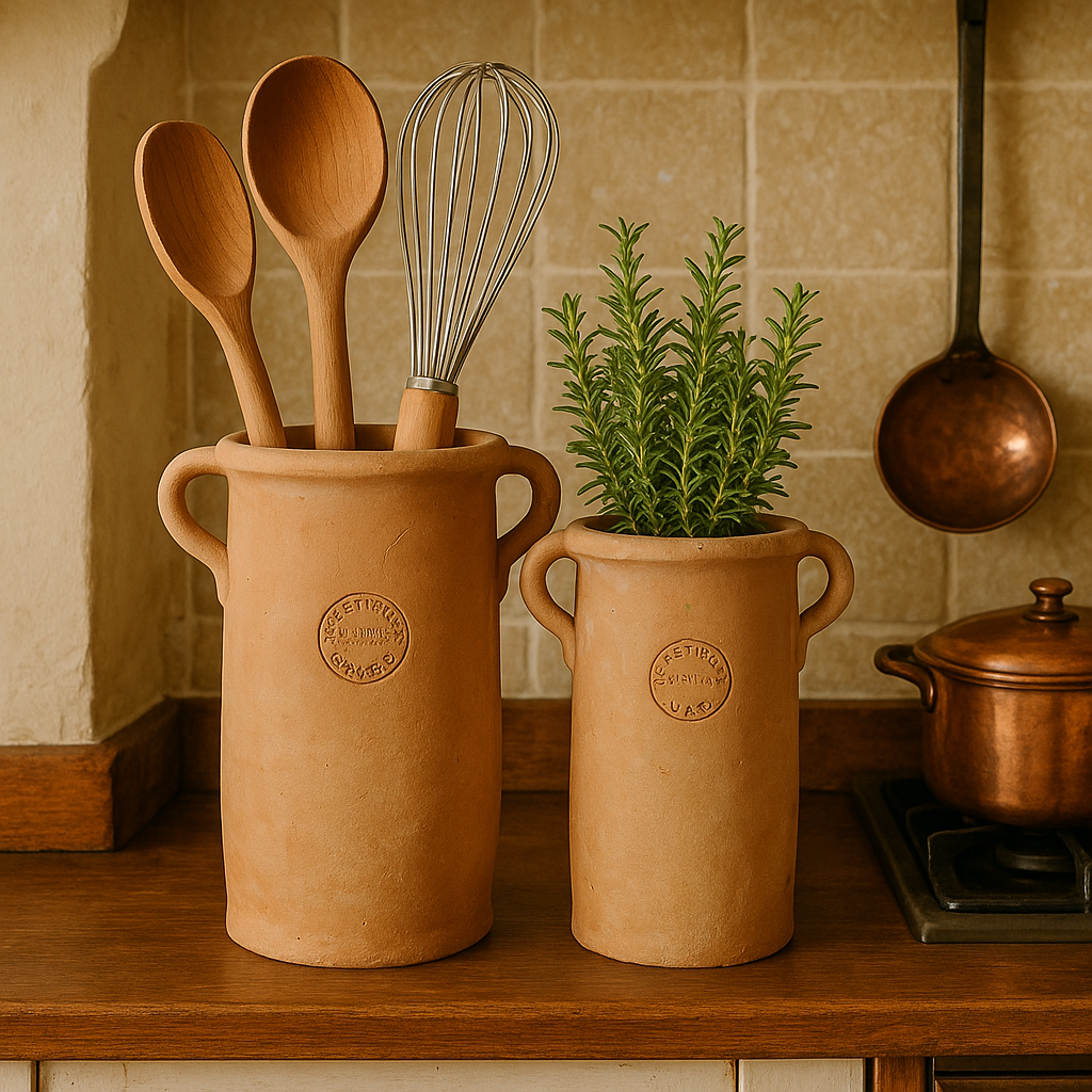 Crafted from durable, breathable terracotta and designed with a rustic handle, this pot is both stylish and functional—ideal for larger herbs, flowering plants, or makes a fabulous kitchen utensil holder.